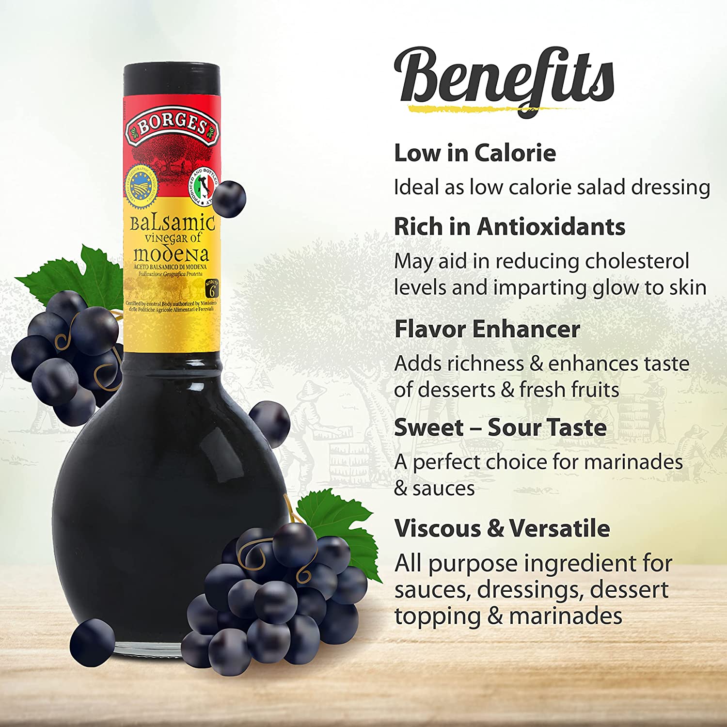 - With natural sweetness of Italian grapes, IGP certification guarantees the quality and flavour of our vinegar, produced in our cellar in Modena, Italy